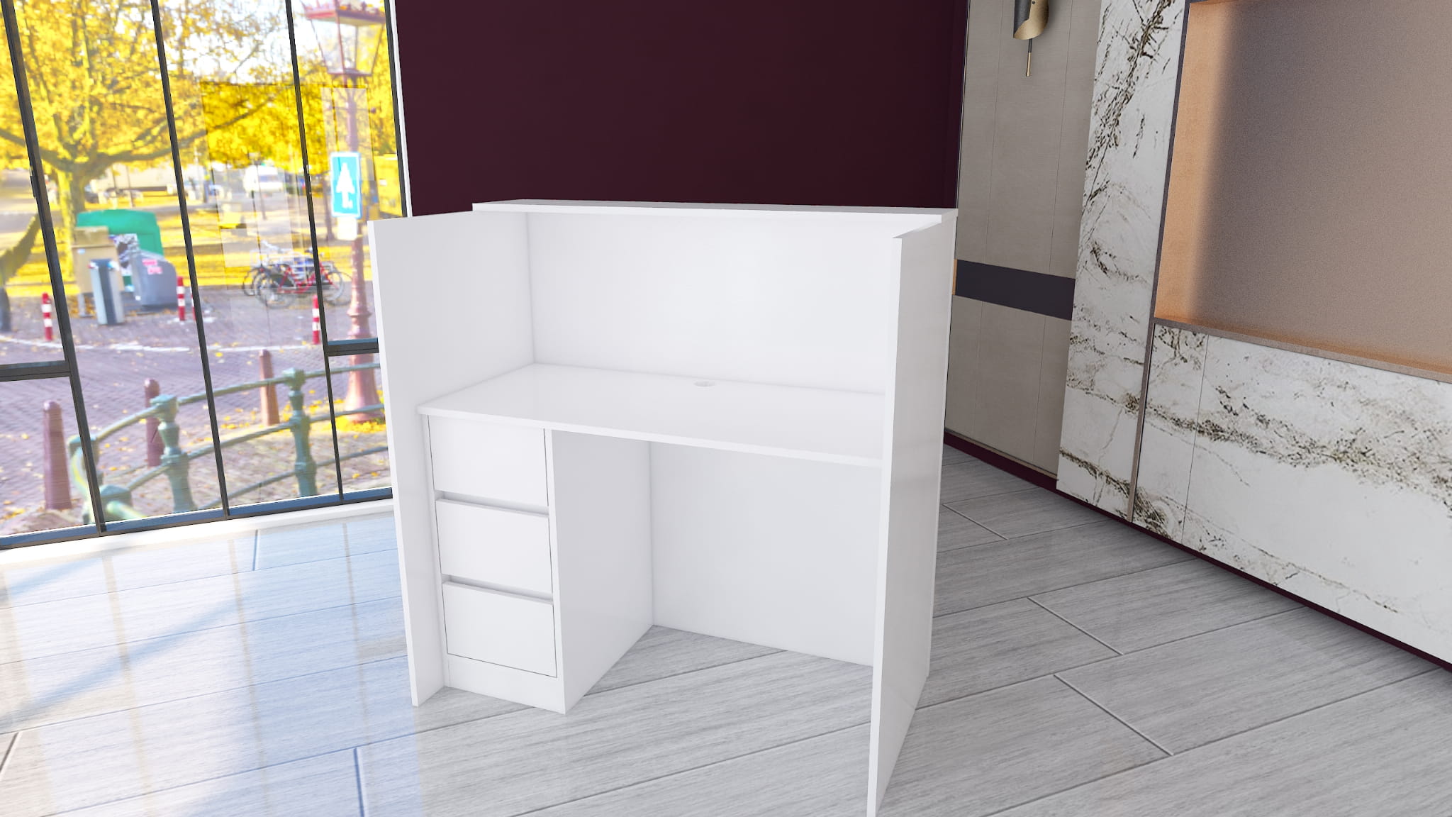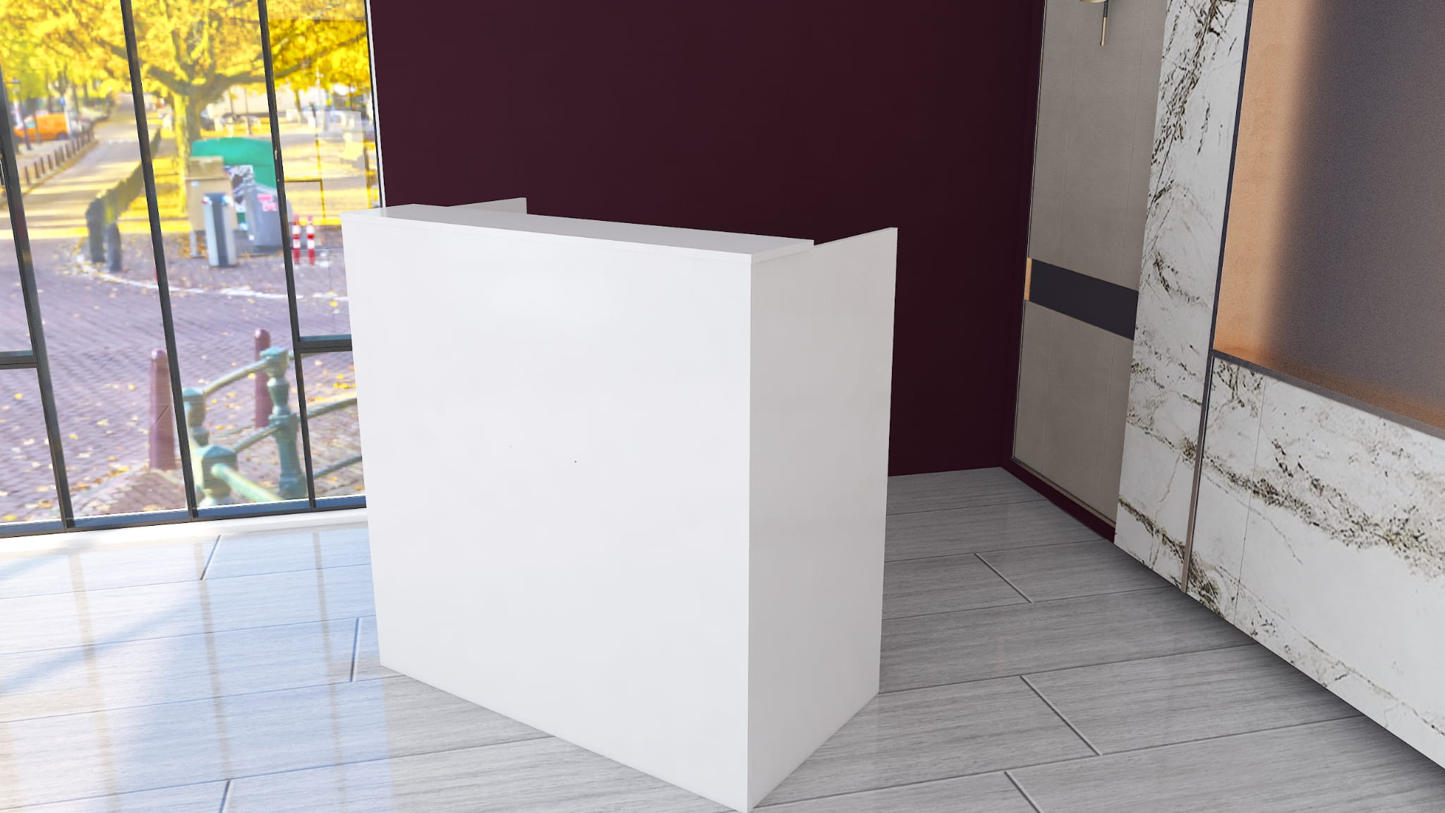 Minimalistyczna biała lada recepcyjna w nowoczesnym wnętrzu z dużym oknem.