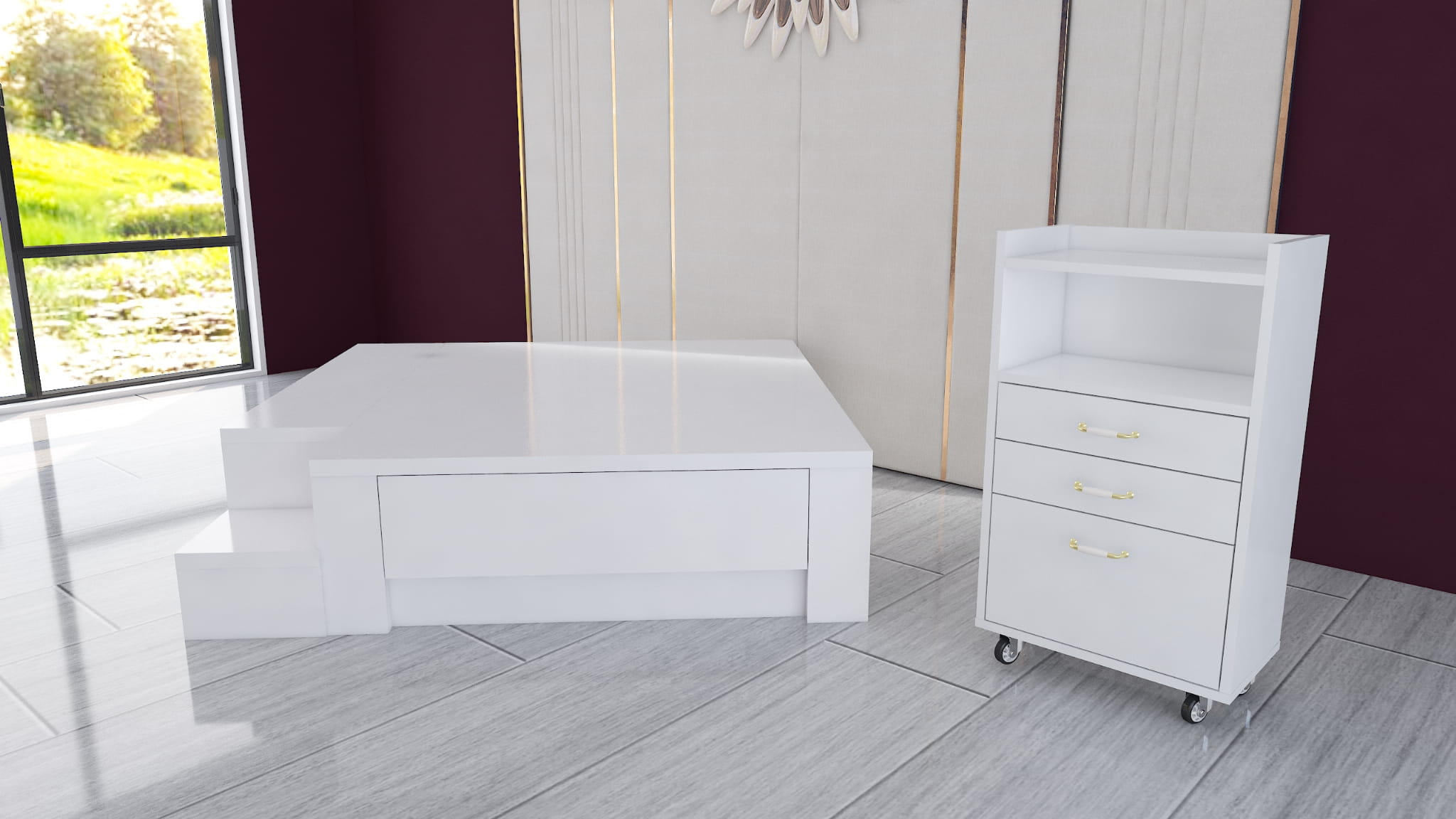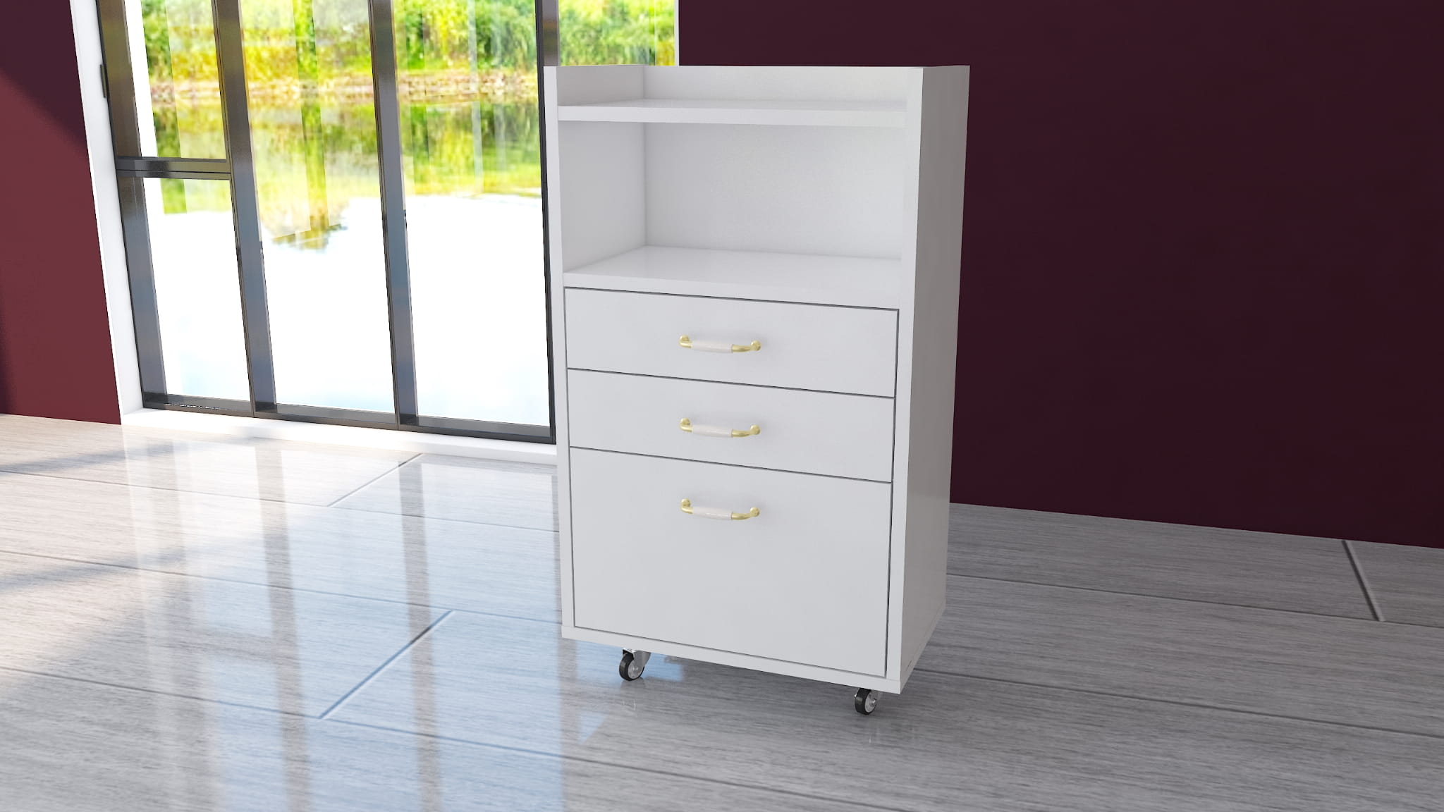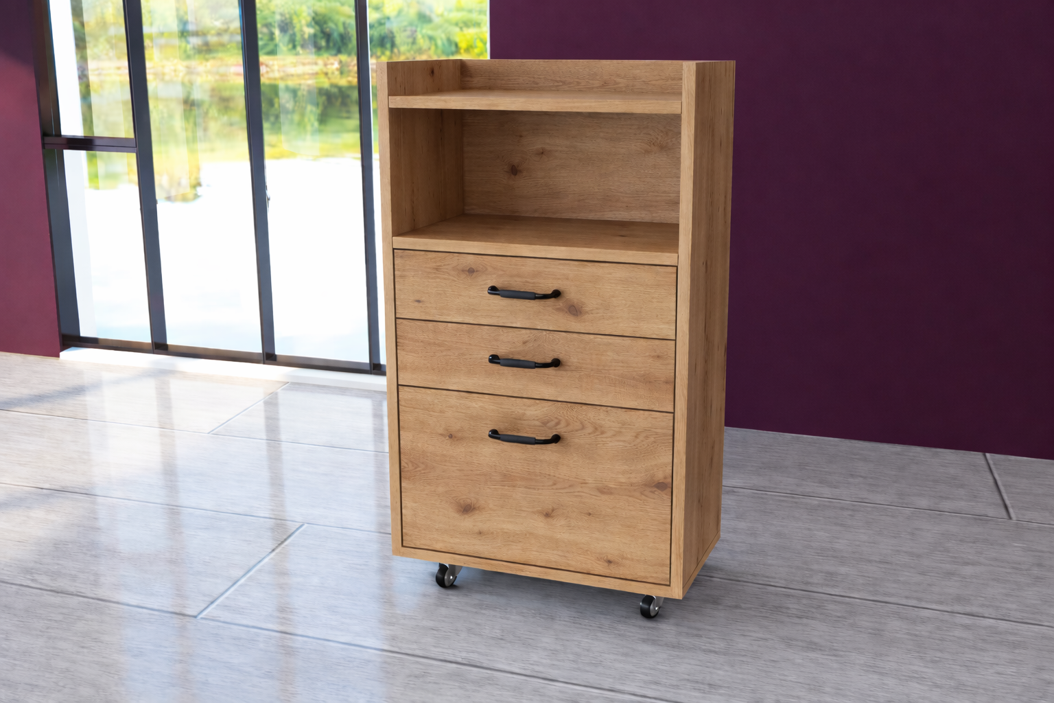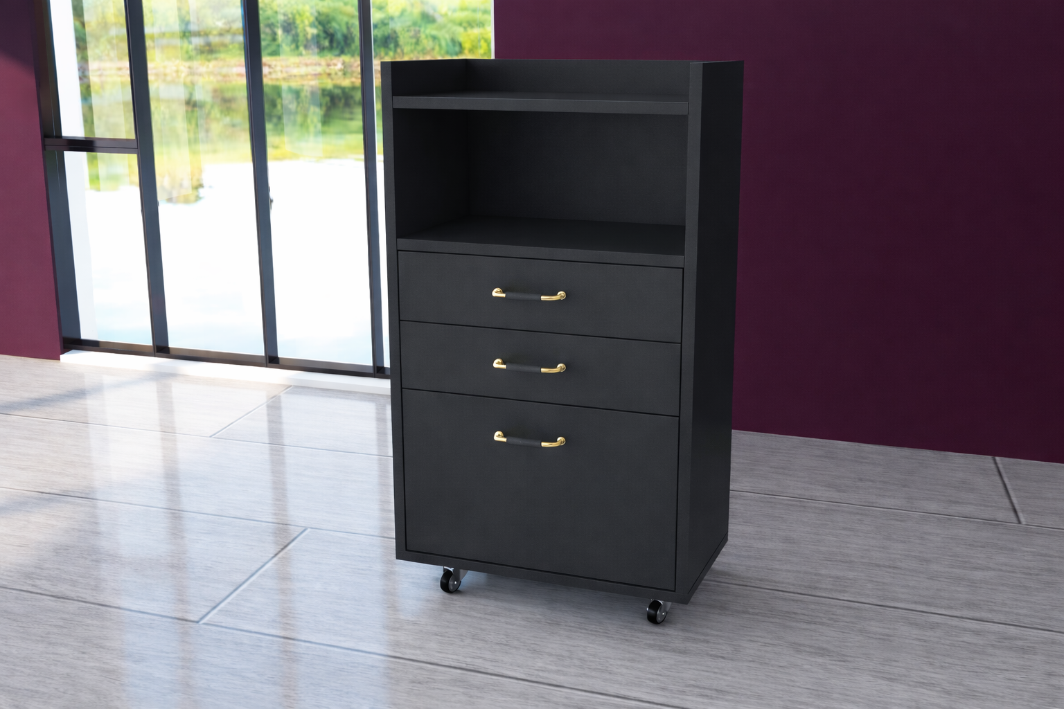 Idealna dla profesjonalistów i pasjonatów pielęgnacji, ta elegancka, mobilna szafka kosmetyczna łączy nowoczesny design z wysoką funkcjonalnością. Dzięki trzem pojemnym szufladom, otwartej półce oraz przemyślanej konstrukcji, zapewnia wygodny dostęp do wszystkich niezbędnych akcesoriów i narzędzi.