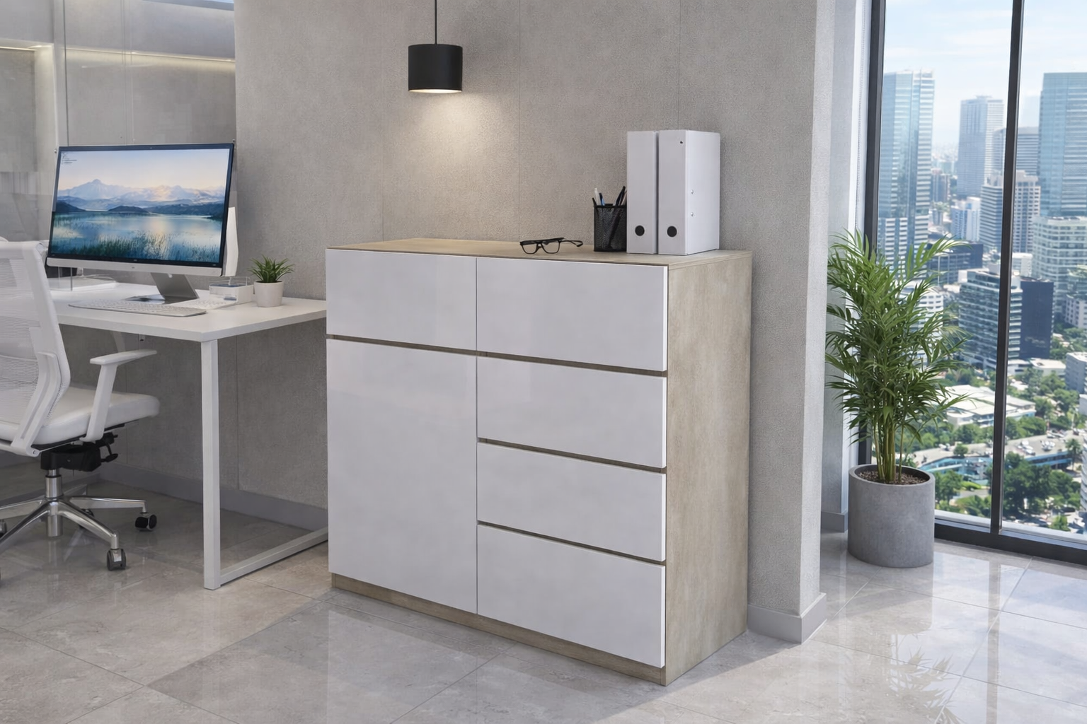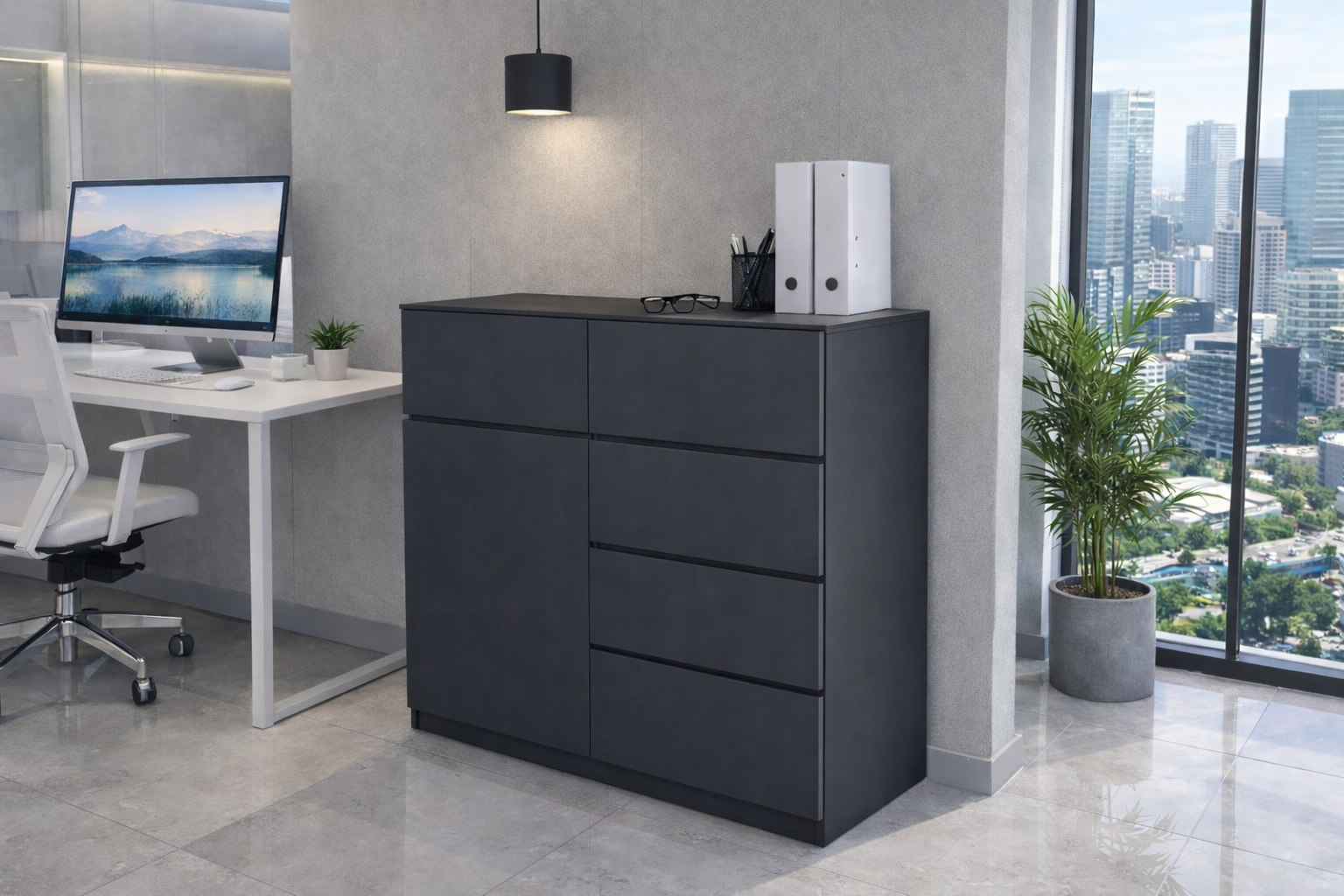 Prosta forma bez uchwytów oraz gładkie fronty nadają meblowi nowoczesny, profesjonalny charakter. Komoda oferuje praktyczne szuflady oraz zamykaną przestrzeń, umożliwiając wygodne przechowywanie dokumentów, akcesoriów biurowych i innych przedmiotów.