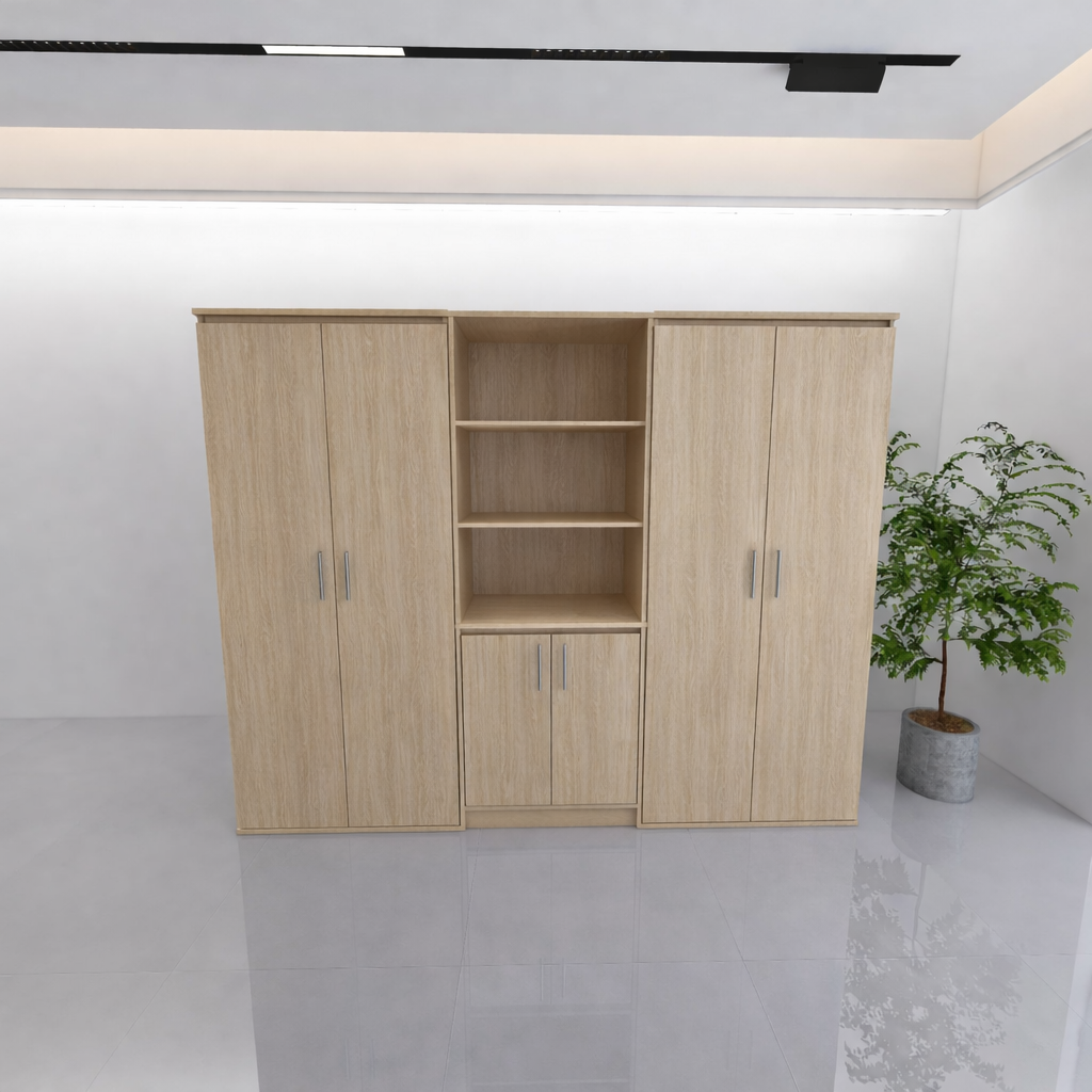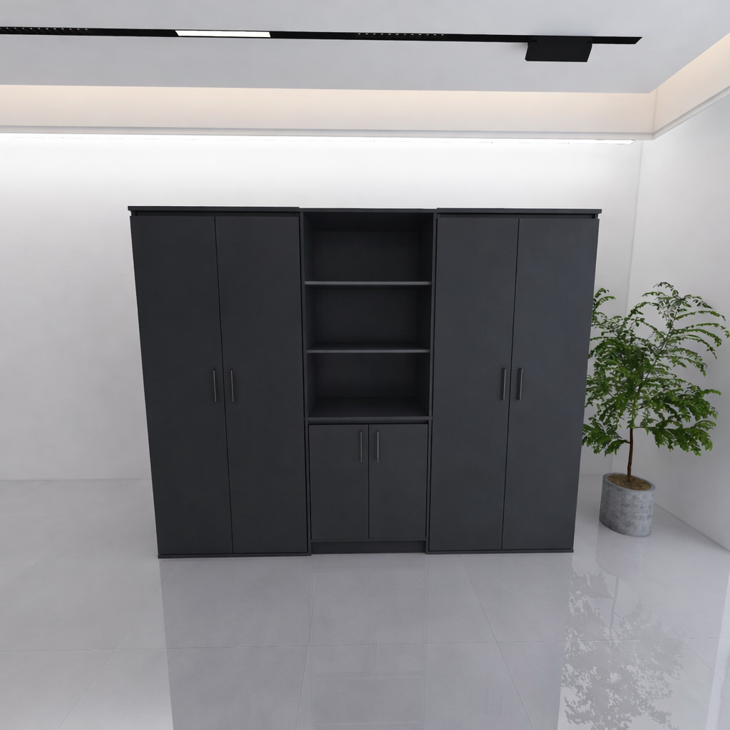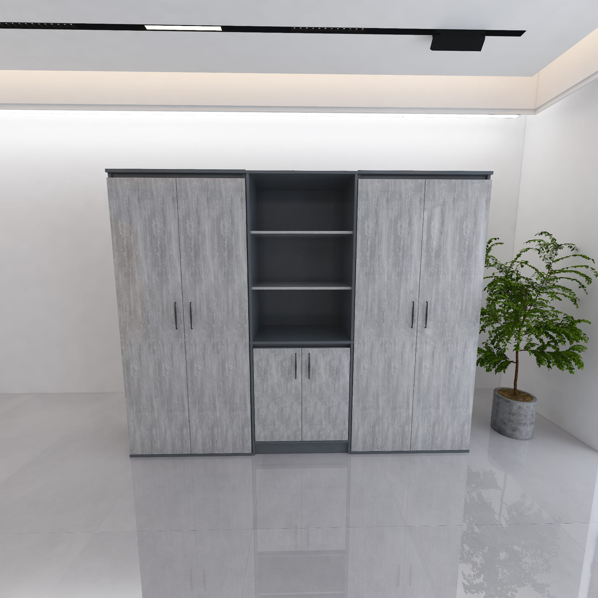 to komplet mebli zaprojektowany z myślą o nowoczesnych przestrzeniach pracy. Połączenie dwóch zamykanych szaf z centralnym regałem pozwala na wygodne przechowywanie dokumentów, segregatorów, sprzętu biurowego oraz ekspozycję książek czy materiałów firmowych.