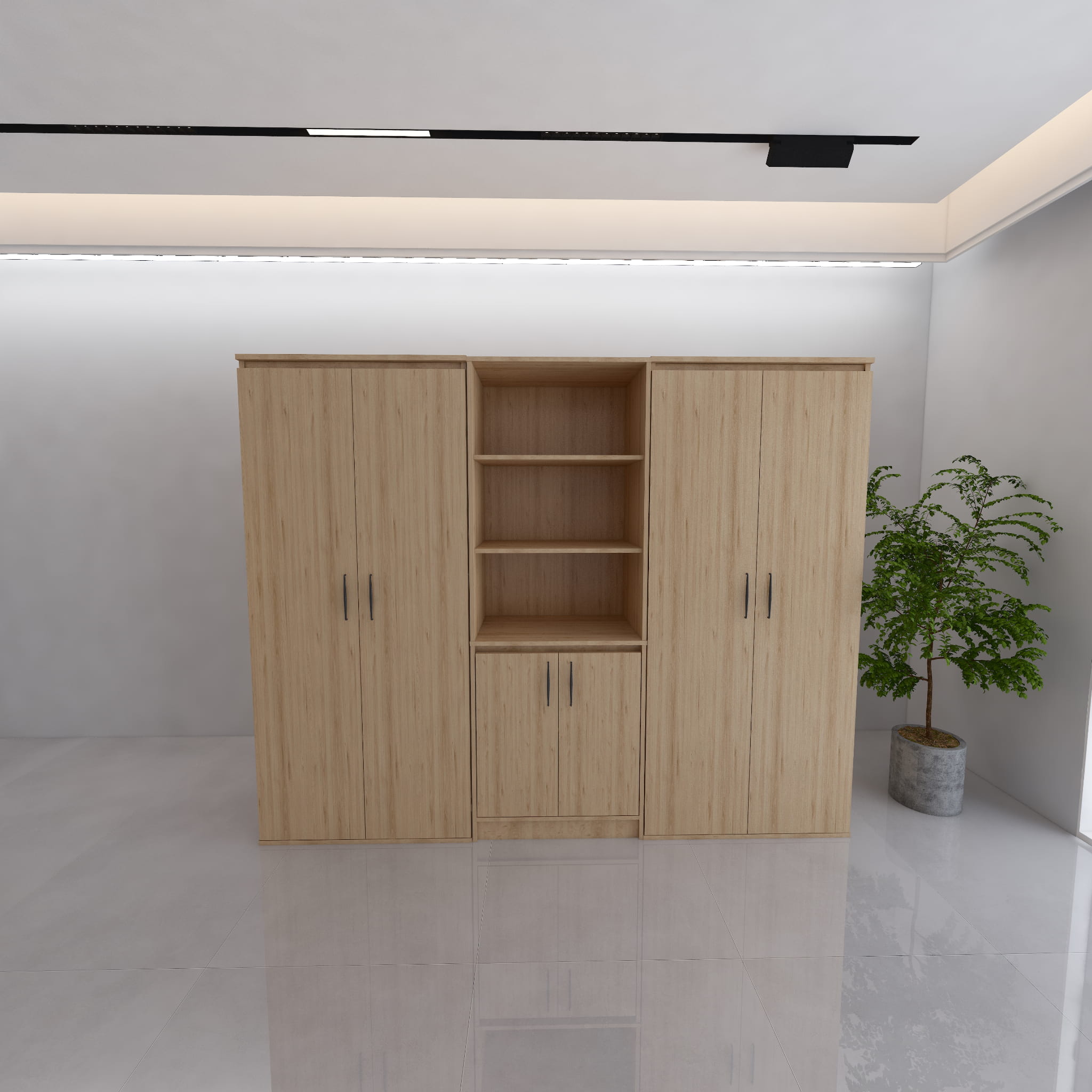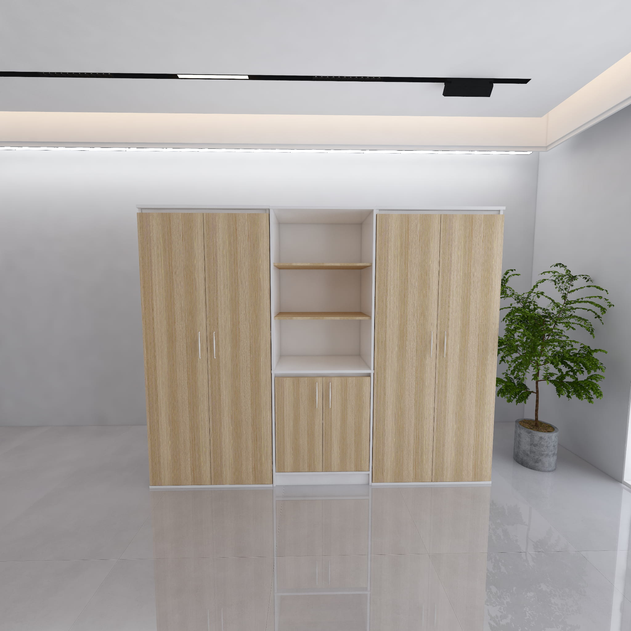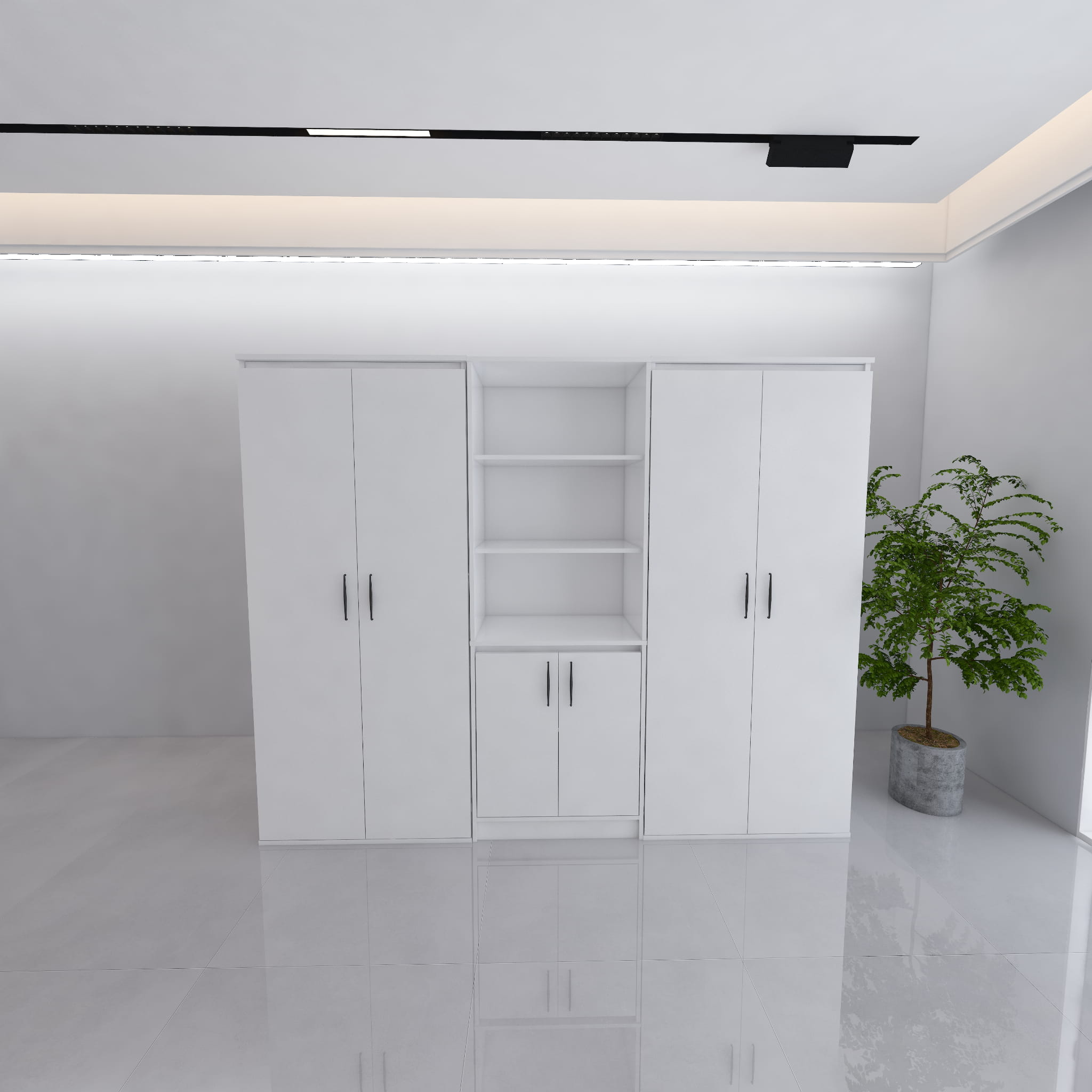 to komplet mebli zaprojektowany z myślą o nowoczesnych przestrzeniach pracy. Połączenie dwóch zamykanych szaf z centralnym regałem pozwala na wygodne przechowywanie dokumentów, segregatorów, sprzętu biurowego oraz ekspozycję książek czy materiałów firmowych.