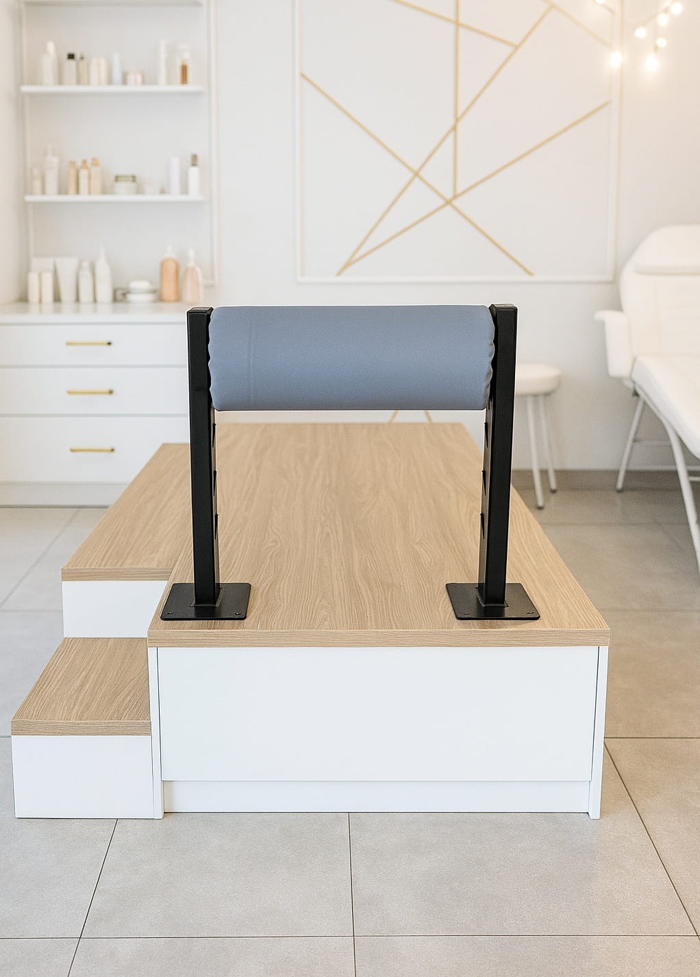 Stabilna powierzchnia z dużą, pojemną szufladą ułatwia przechowywanie akcesoriów, ręczników czy narzędzi, a szerokie schodki zapewniają klientkom bezpieczne i wygodne wejście na stanowisko.