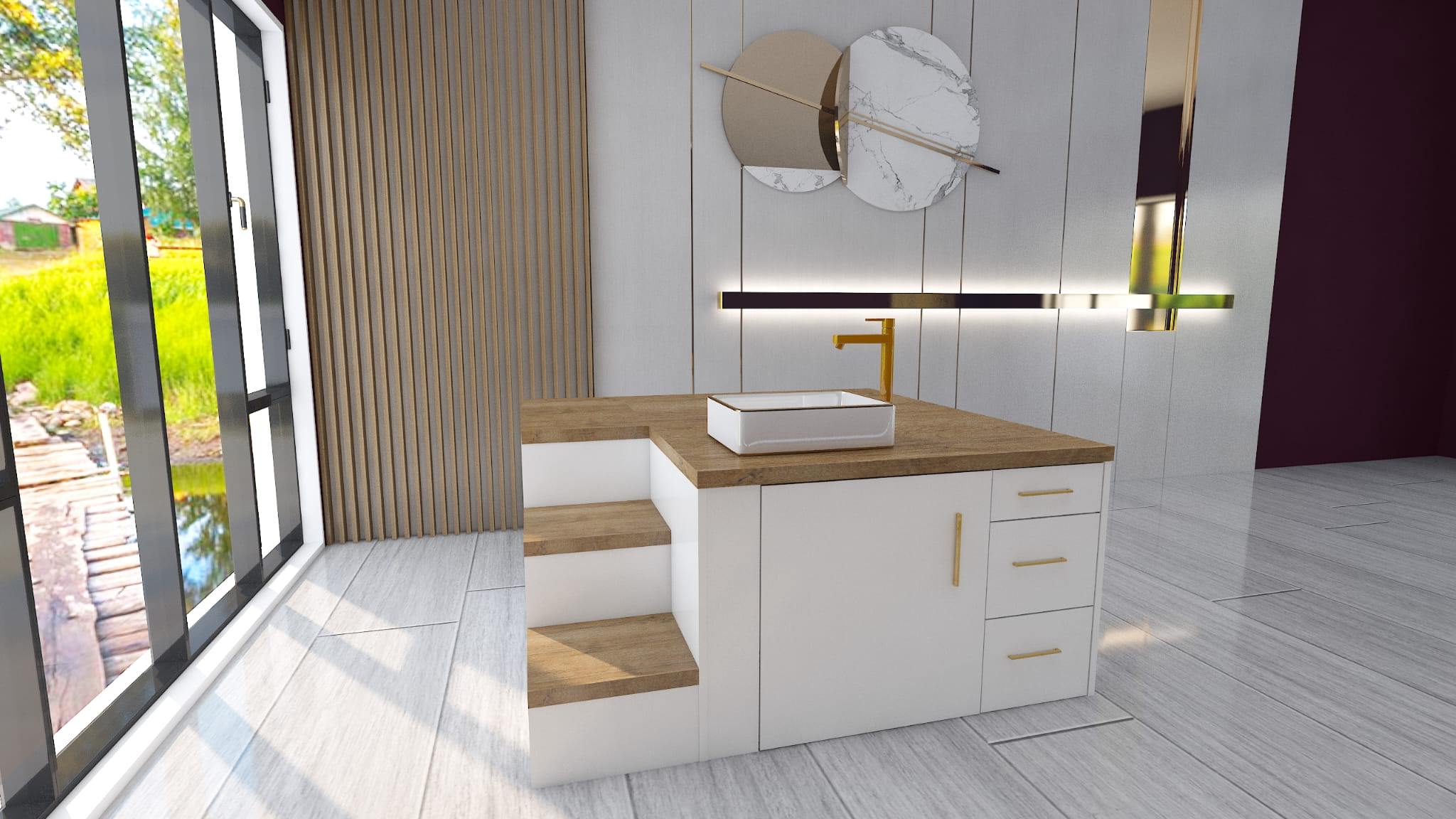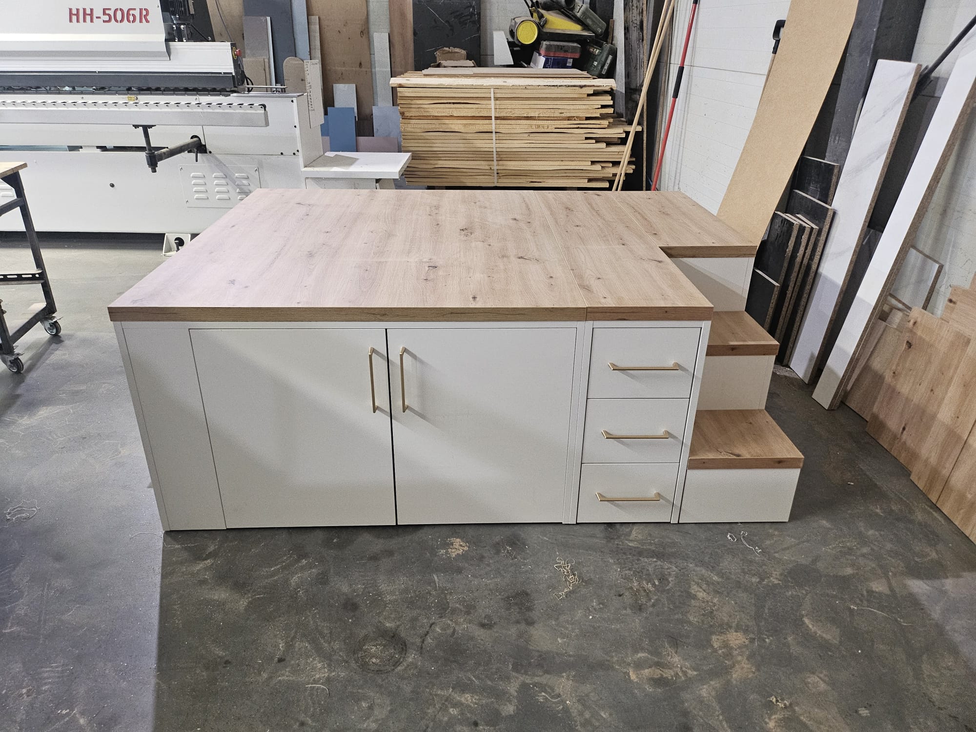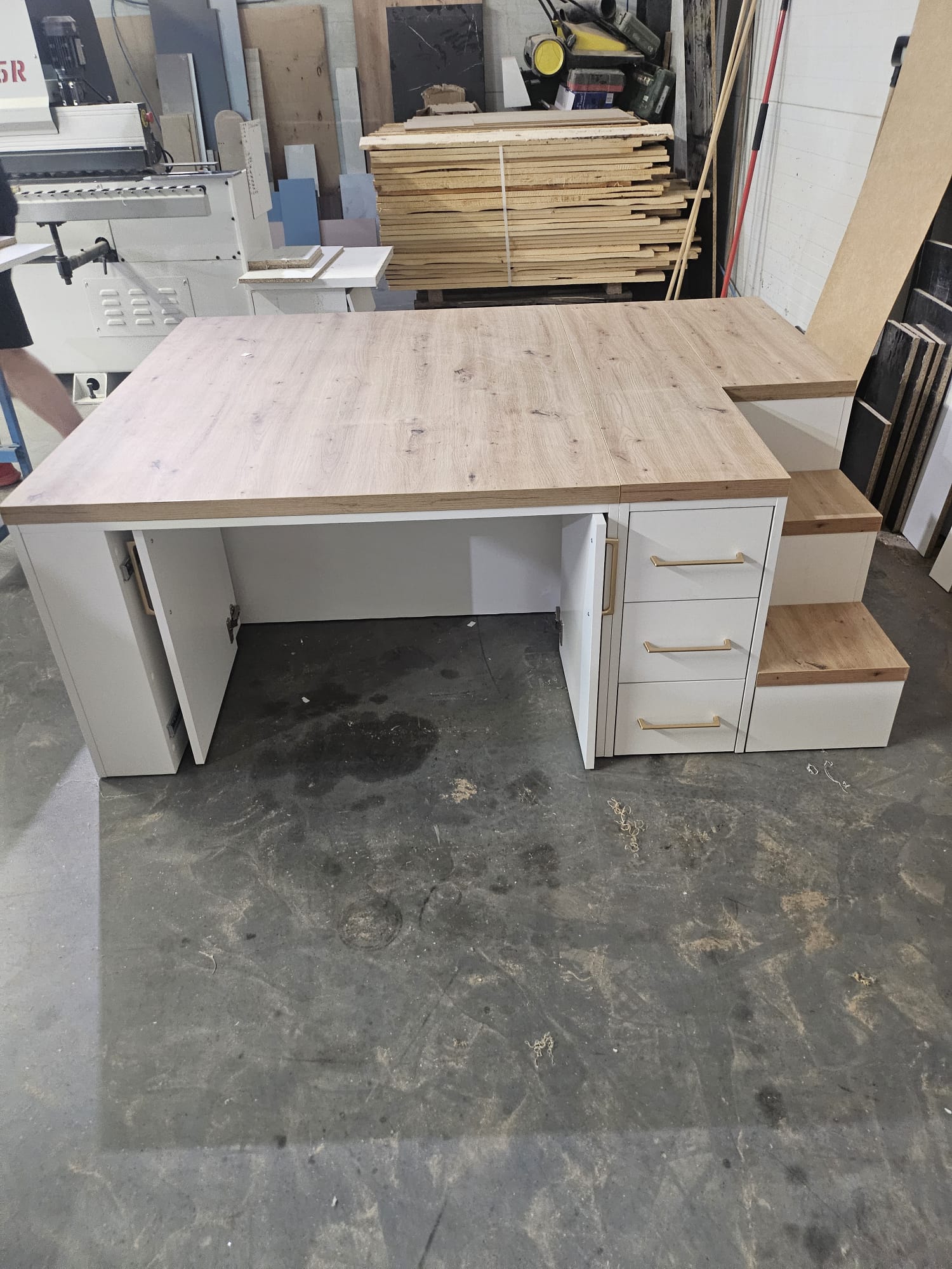 Prezentowany podest do pedicure to idealne rozwiązanie do nowoczesnych salonów kosmetycznych, gabinetów podologicznych i SPA. Wyróżnia się minimalistycznym designem, łączącym drewno o naturalnym wykończeniu z białą zabudową oraz eleganckimi złotymi akcentami. Na blacie jest możliwość wywiercenia otworów montażowych pod armaturę i kran.