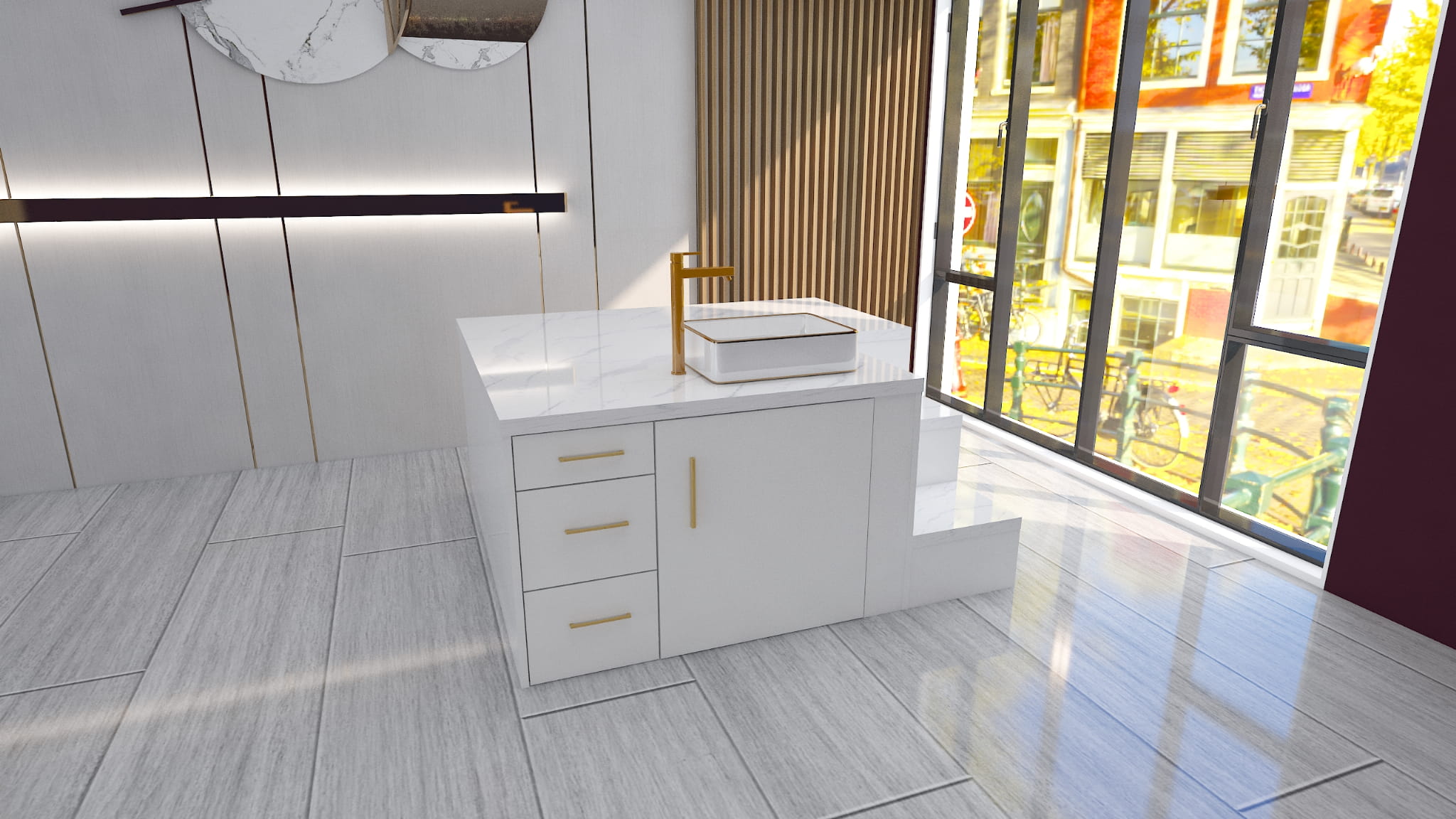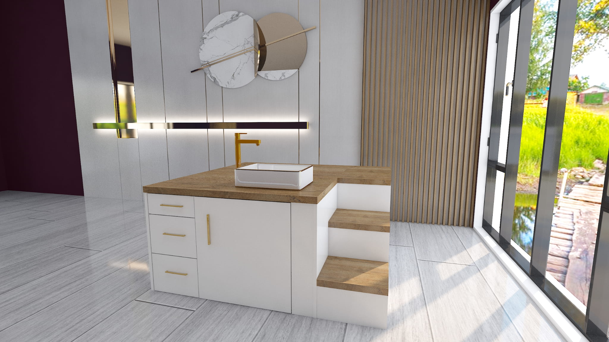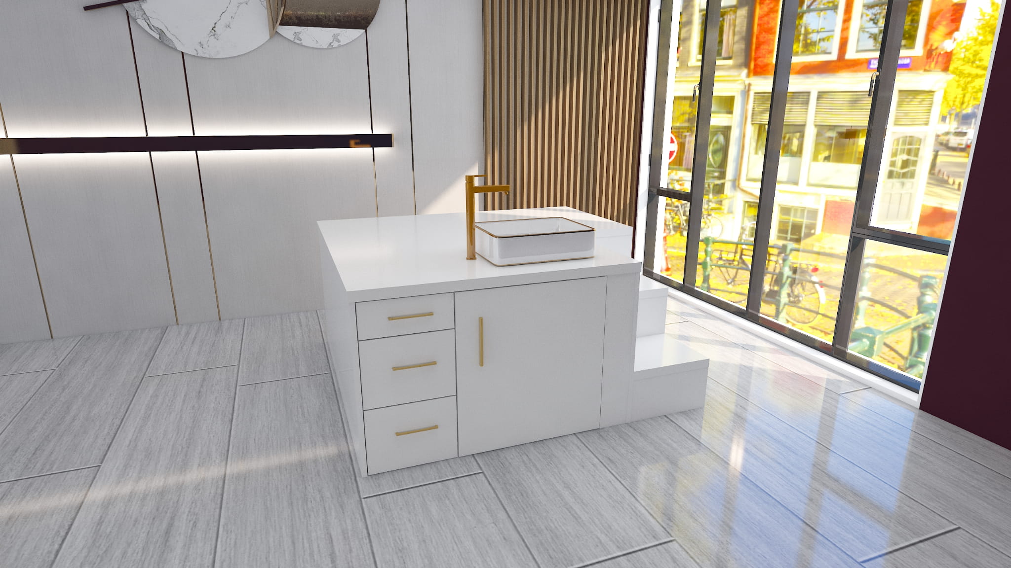 Prezentowany podest do pedicure to idealne rozwiązanie do nowoczesnych salonów kosmetycznych, gabinetów podologicznych i SPA. Wyróżnia się minimalistycznym designem, łączącym drewno o naturalnym wykończeniu z białą zabudową oraz eleganckimi złotymi akcentami. Na blacie jest możliwość wywiercenia otworów montażowych pod armaturę i kran.